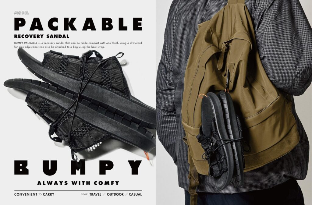 BUMPY(バンピー)は、「かさばる」「持ち運びにくい」など、リカバリーサンダルの “あと少し” というところにピタッとはまる、新しいサンダルブランドです。