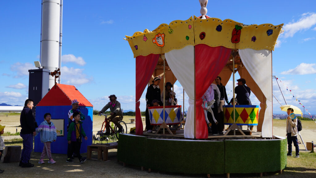 子どもたちや障がいのある方の描いた動物たちが乗るメリーゴーラウンドの展示型作品と、サーカスパレートによるパフォーマンス『今治里山にサーカスパレードがやってくる』(アーティスト:来島会with瀬戸内サーカスファクトリー)。