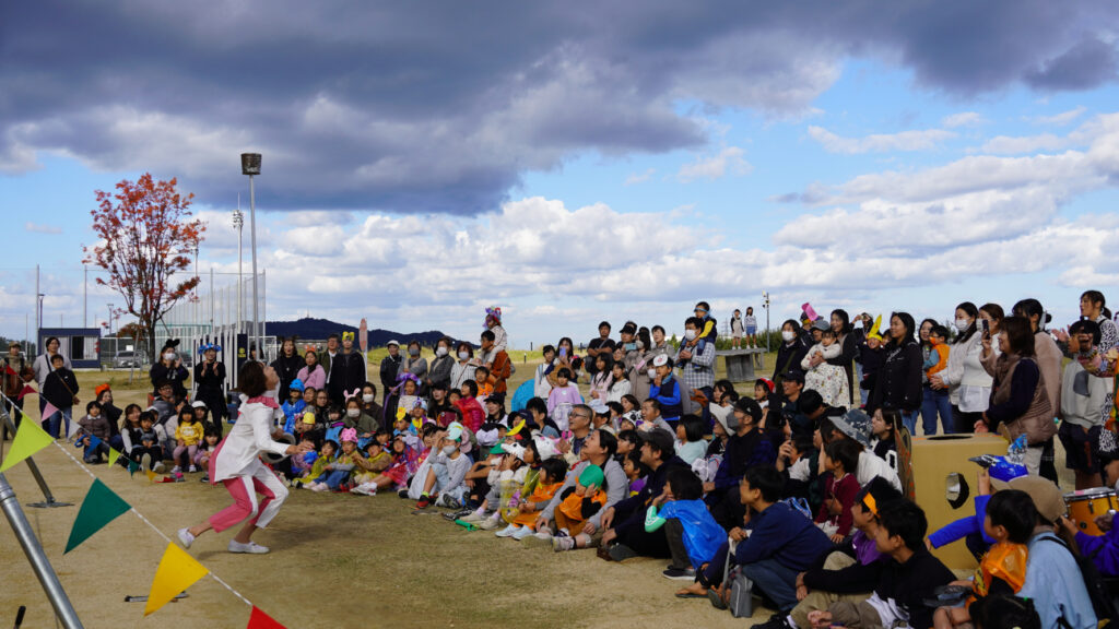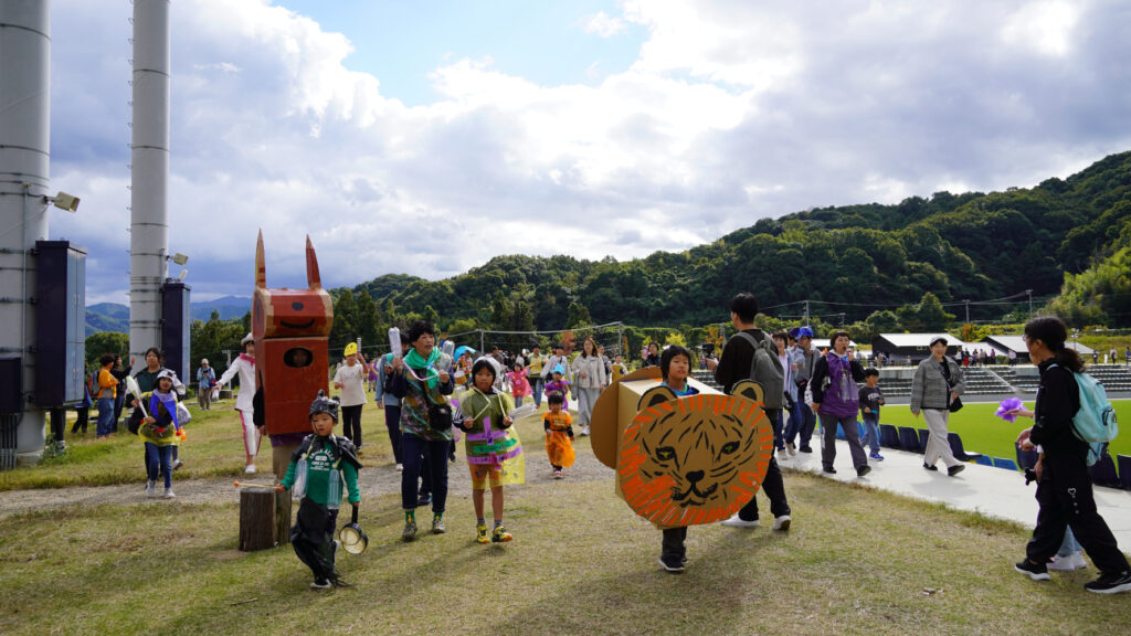 「文化・交流拠点として地域と人を繋ぐ。365日賑わうスタジアム。アシックス里山スタジアム」でのサーカスパレード。天候にも恵まれ、たくさんの人たちが思い思いに参加してくれ、素敵なサーカスパレードとなりました。会期中展示していました「モンタージュ メリーゴーラウンドと動物のサーカス団」を見て、11月3日のパレードに参加された方も多数いらっしゃり、里山スタジアムが多様な表現で満たされた時間はまさにアートによる力だと確信しました。素敵な時間と空間を作り出せましたこと、来場された皆様はじめ関係するすべての皆さまに感謝申し上げます。