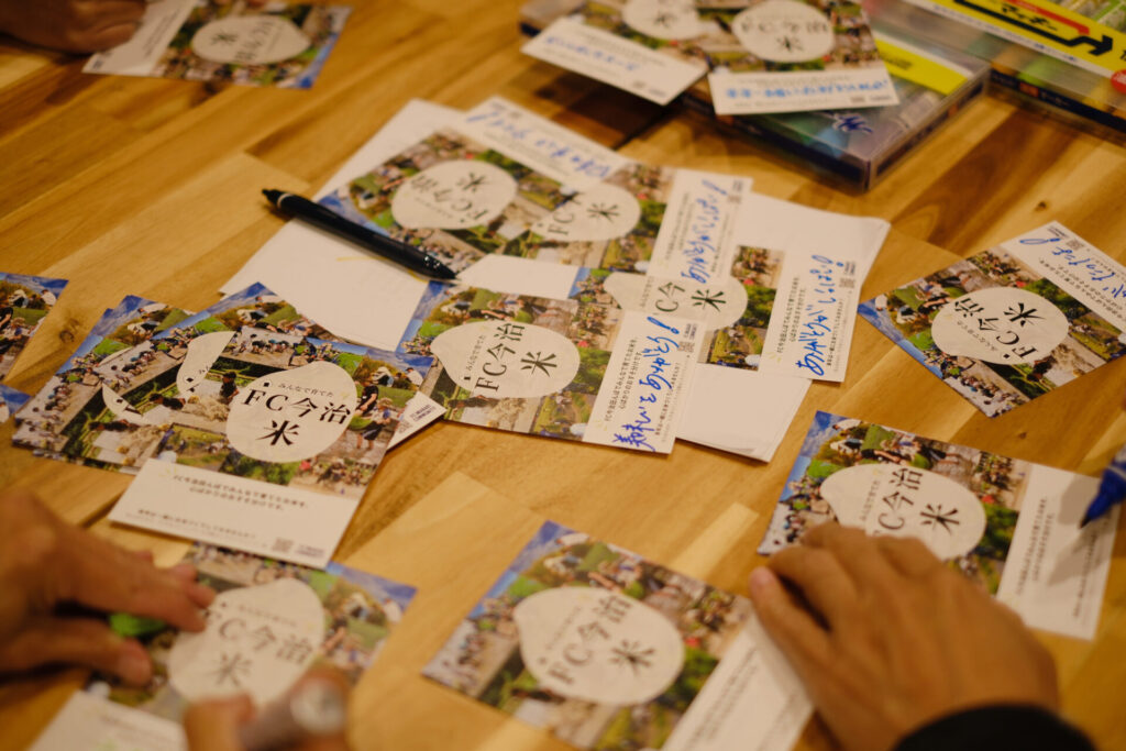 収穫した新米は、ただ食べるだけでなく、ホーム戦に来てくれるサポーターにもおすそ分け。参加してくれたみんなで、カードにメッセージを書きました。