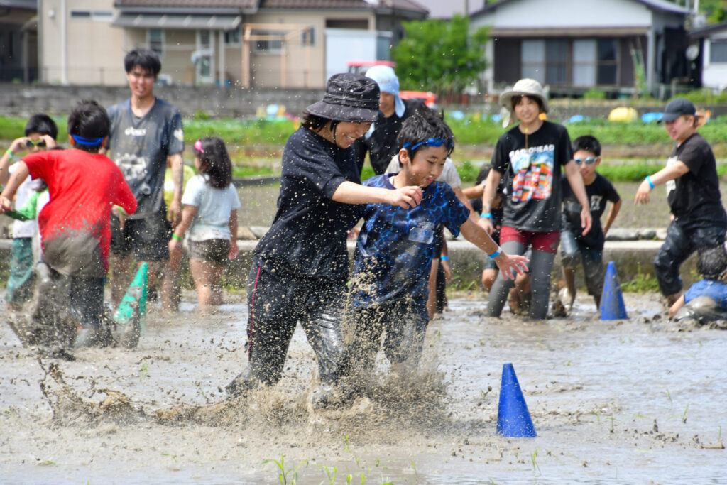 仲良しの川原さん家族も誘って、どろリンピックには母子で、草刈りや稲刈りには子どもたちが参加。泥まみれで「親も童心に帰って」遊びながら、お米のできる過程を体験しました。