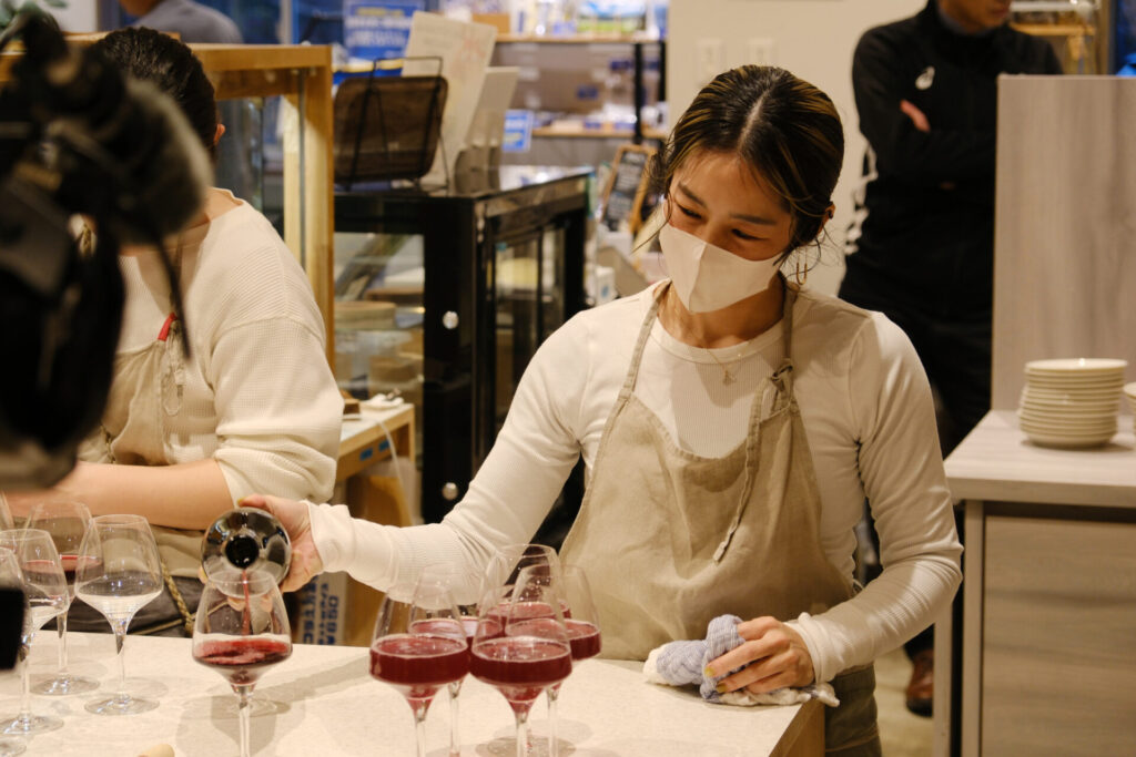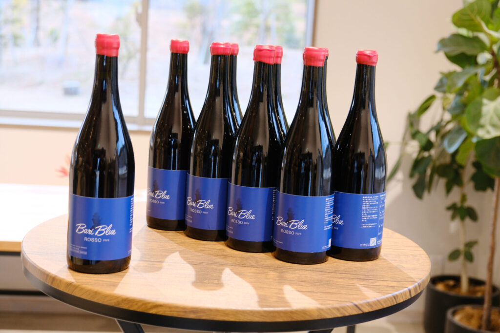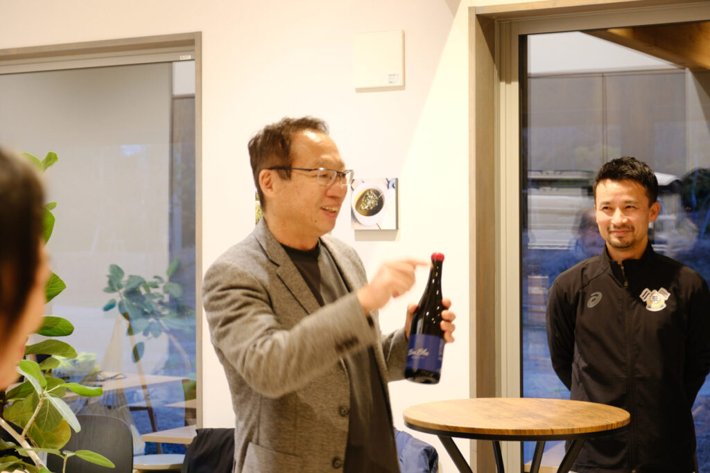 今回は、今まで一緒にぶどうを育ててきた16人「ヴィンヤードクルー」のほか、大三島みんなのワイナリーの森本さん、川田さん、元FC今治スタッフで初めてアシックス里山スタジアムでのぶどうのお世話を始めた黒川さんにもお越しいただき、初のスタジアム産ワイン「Bari Blue」を味わう時間を過ごしました。