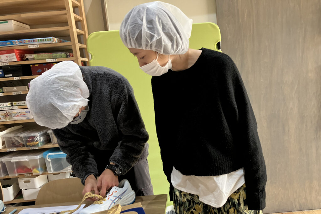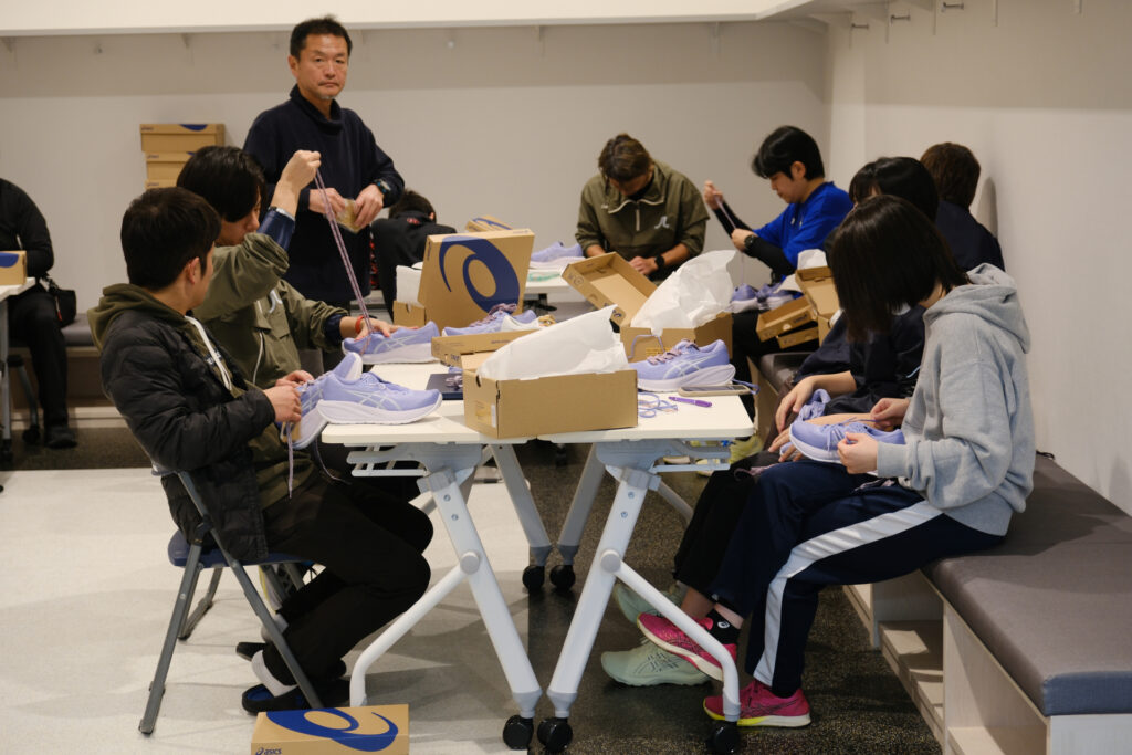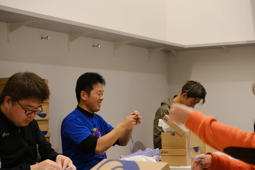 アシさとクラブでは、アシさとクラブのコーチを含め総勢20名でシューズの紐を手分けしました。シューレースを取り付けながら、話題に上がるのはやはりFC今治のこと。「今度の試合ではあの選手に活躍してもらいたい」、「自分がシューレースを通したシューズはあの選手に履いてほしい」、「こんな大きいサイズのシューズだときっとゴールキーパーが履くんじゃないか」。たくさんのシューズに紐を通すのは単調な作業ですが、仲間と話しながらだと自然に笑顔がほころびます。