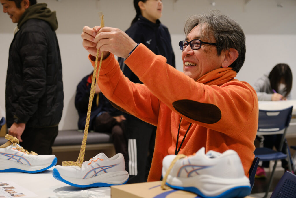 実はこのシューレースは、今治タオルの残糸(タオルの生産過程で製品にならずに余ってしまった高品質な糸)でできた特別な紐です。地域に根ざしたサステナブルな素材を選手に身に付けてもらおうと、FC今治トップチーム選手・スタッフ、FC今治レディース選手・スタッフがオフピッチで着用するシューズと、FC今治バックオフィススタッフ分を含めた計240足分のシューズの紐を、アシックス里山スタジアムに併設された複合福祉施設「コミュニティビレッジ きとなる」と「アシさとクラブ」の皆さんが一つひとつ手作業で取り付けました。