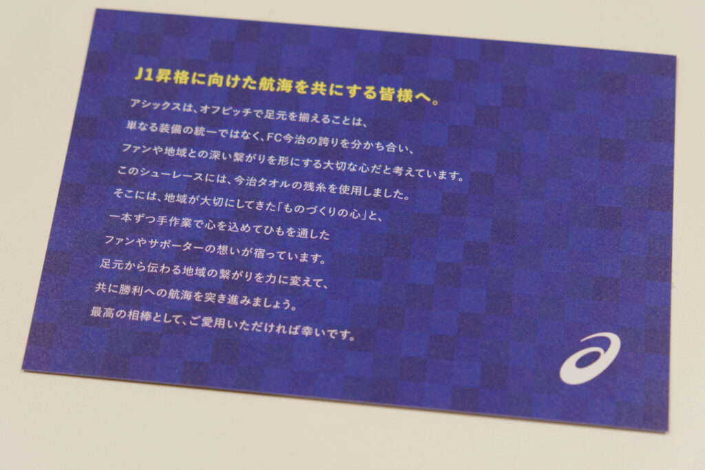 「コミュニティビレッジ きとなる」と「アシさとクラブ」の皆さんが取り付けた今治タオルの特別なシューレースは、チームとファンとの思いを強く結んでくれていることでしょう。