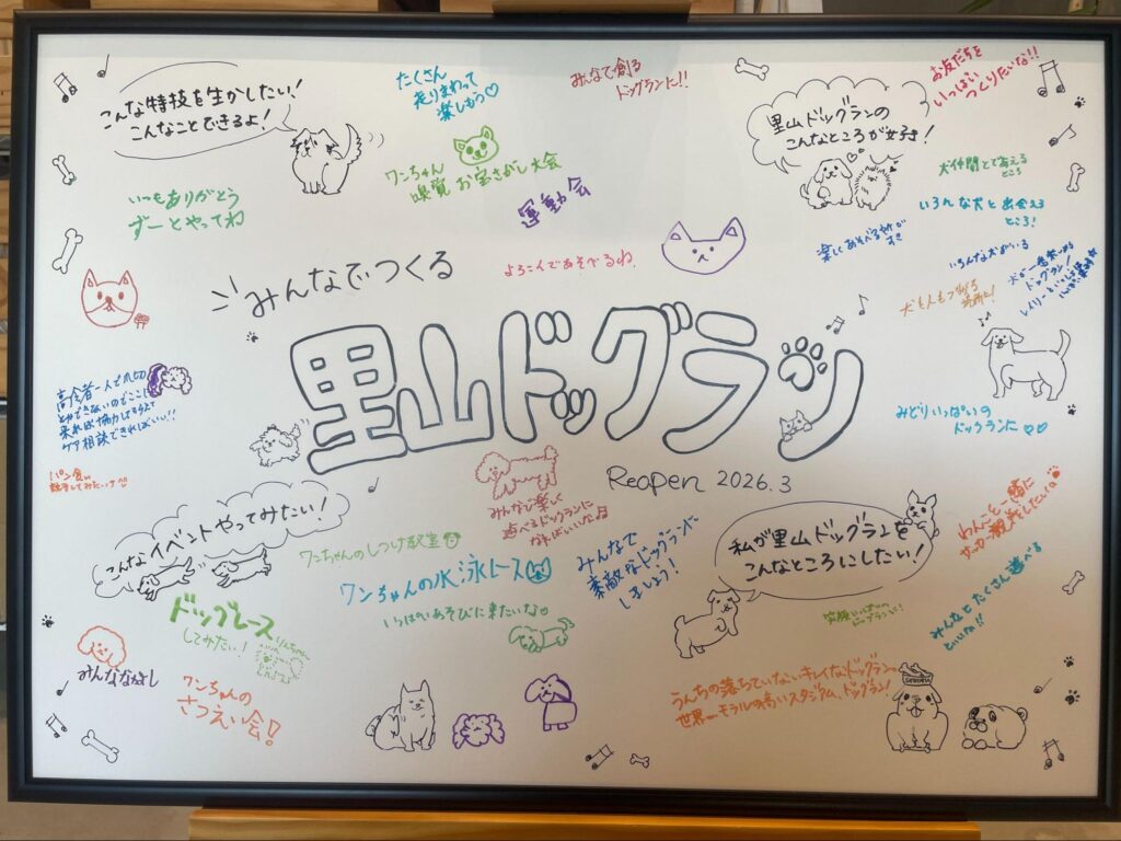 完成したボードは、色塗りをして夏頃完成予定のドッグラン内コンテナ休憩室に展示したいと思っております。現在は里山サロンのテラスに飾ってあります。ワンちゃんと一緒に覗きにいらしてください。まだまだ寄せ書きも募集していますので、里山サロンのスタッフにお気軽にお声がけください。