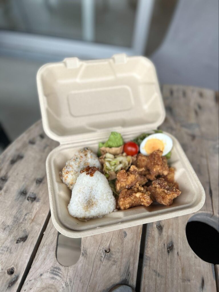 ・お弁当の内容:DOORS GROCERYの2色おにぎり(もろ味噌とごまかつお)、DOORS GROCERY有機認証のごま和えを使ったキャベツの副菜、DOORS GROCERY保存料無添加のめんつゆを使った唐揚げ、他