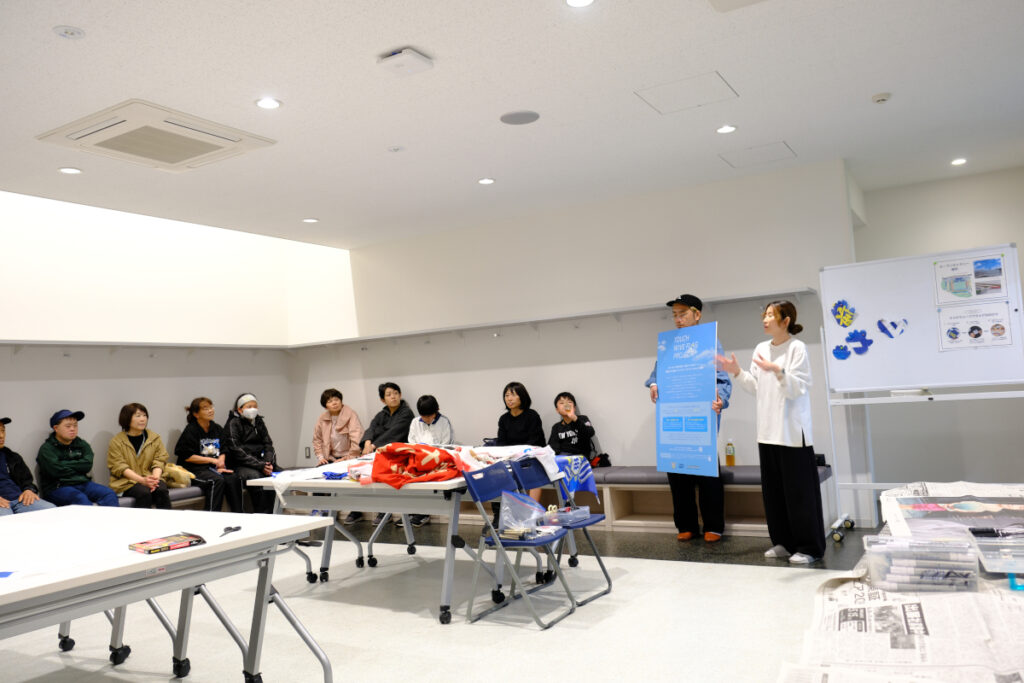2026年4月4日(土)、FC今治のホームゲームの前日設営を終えたばかりのボランティア「Voyage」の皆さんにご参加いただき、タッチウェーブフラッグプロジェクトのワークショップを行いました。スタジアムを誰よりも愛し、支えてくださる皆さまの「手」で、工事中の白い壁をギャラリーへ。記念すべき1回目のワークショップの様子をお届けします。